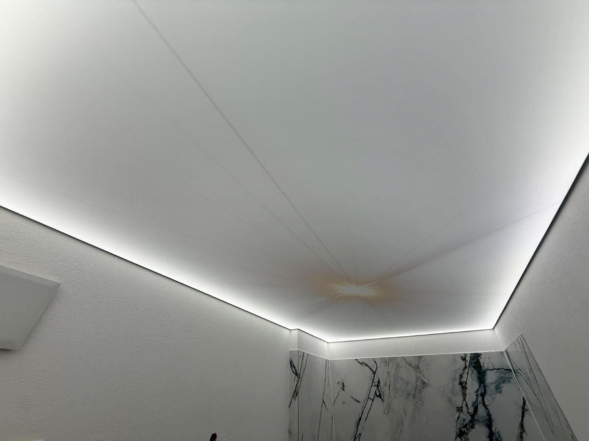 Spanndecke Matt - Planung und Lieferung einer Spanndecke Matt Satin 3D Struktur zur Raumgestaltung eines Bades. Der Wandabschluss der Decke wurde als Wandabschluss mit einer umlaufenden Schattenfuge geplant, in welcher umlaufend eine dimmbare LED Lichtleiste in der Lichtfarbe warmweiß zur Raumausleuchtung vorgesehen wurde.
