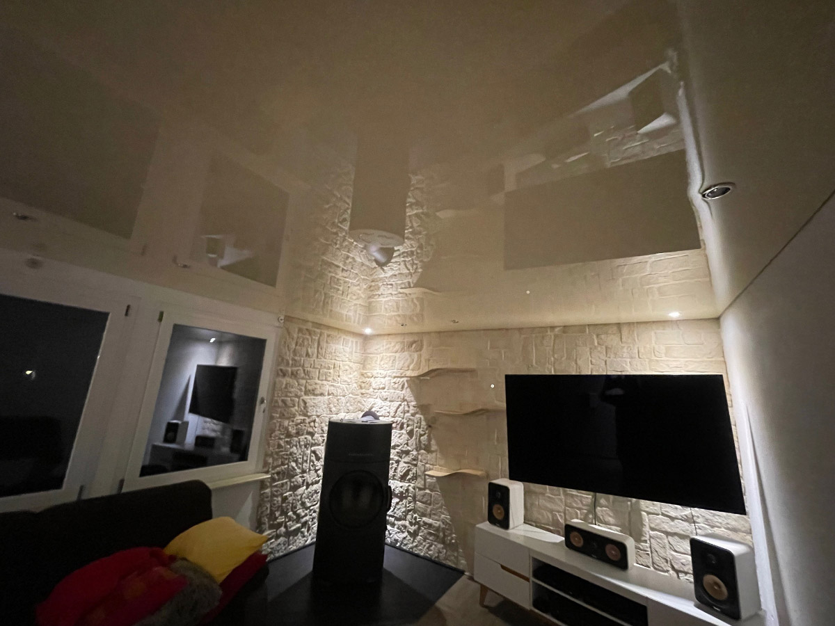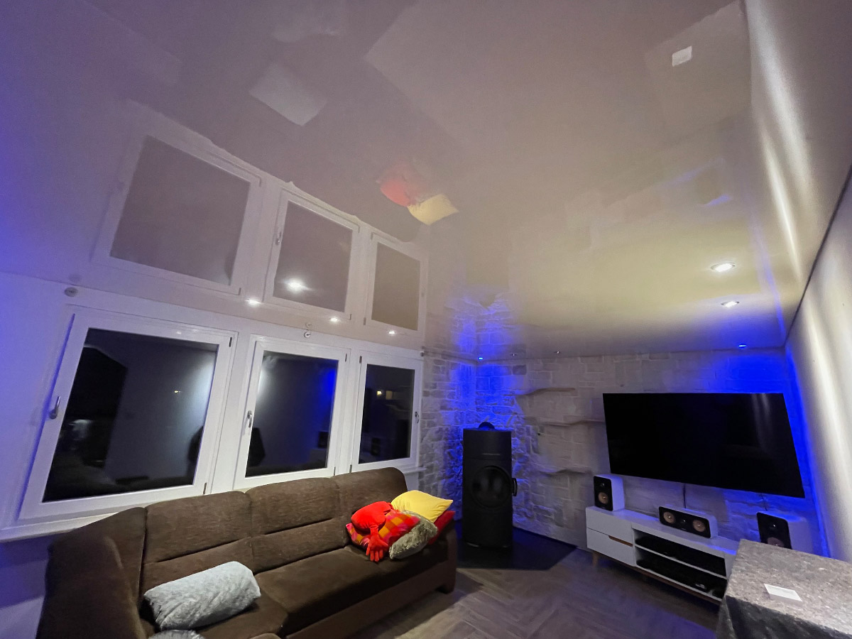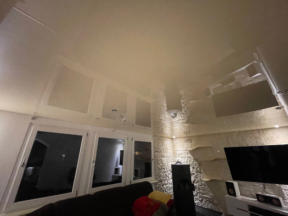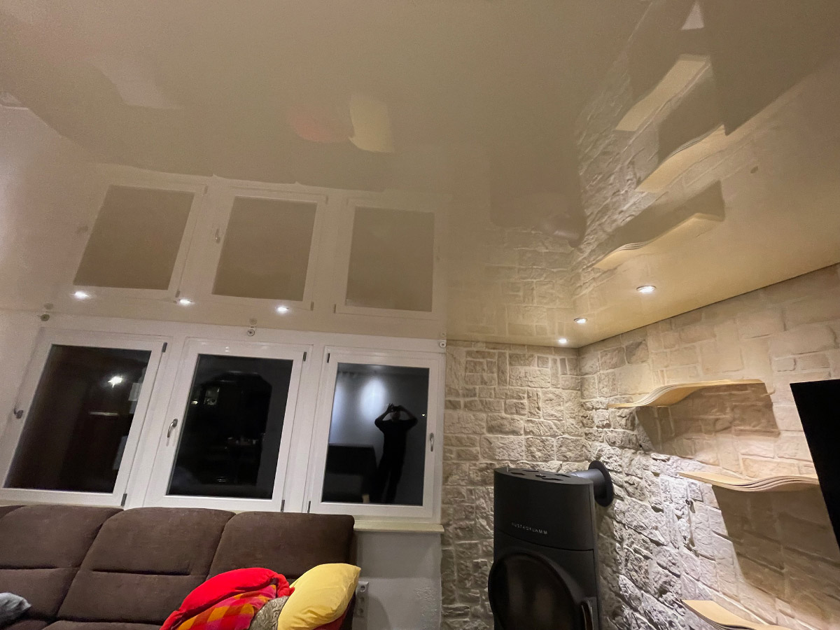Spanndecke Hochglanz - Planung und Lieferung einer Spanndecke Hochglanz beige zur Decken und Beleuchtungsgestaltung einer Wohnstube. Zur Raumausleuchtung der Wohnstube wurden 12 Stück dreh- und schwenkbare LED Downlightstrahler in der Farbe Chrom gewählt welche in der Lichtfarbe von 3000kbis 6000k sowie farbig einstellbar sind. Der Wandabschluss wurde mit einer Schattenfuge geplant. Die gesamte Beleuchtung ist mit einem Funkwandtaster in 4 Lichtkreisen komplett dimm und steuerbar.