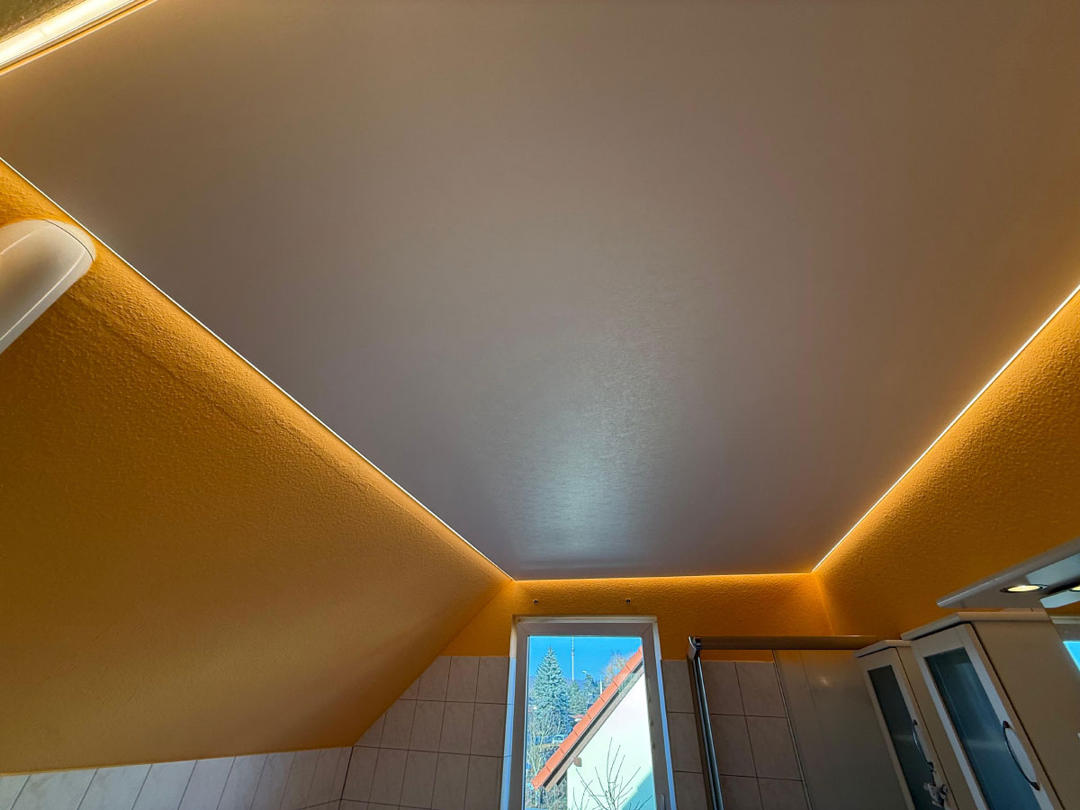 Spanndecke Matt - Planung und Lieferung einer Spanndecke Matt Satin zur Deckengestaltung eines Bades. Zur Raumausleuchtung des Bades wurde eine Kombination aus 3 Stück CCT/ RGB LED Strahlern welche vom Licht weiß und farbig umstellbar sind , sowie einer LED Randausleuchtung gewählt. Der Wandabschluss wurde mit einer Schattenfuge geplant. Umlaufend wurde in der Schattenfuge ein mit einem Funkwandtaster dimmbares warmweißes LED Lichtband integriert, welches durch seine indirekte Abstrahlung für ein angenehmes und entspanntes Badambiente sorgt und getrennt von den Strahlern betrieben werden kann.