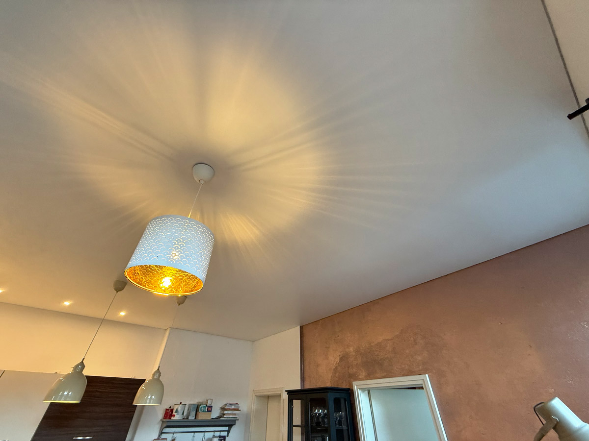 Spanndecke matt - Planung und Lieferung einer Spanndecke Matt weiß zur Raumgestaltung einer Küche. Zur Raumausleuchtung wurde ein dimmbares Lichtspanndeckenfeld in der Größe 1,40m x 0,5m in der Decke integriert. Der Wandabschluss der Decke wurde mit einer Schattenfuge erstellt.